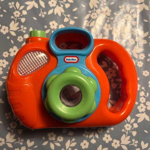 kamera lavet af plast i farverne rød, grøn og blå. Kameraet har et håndtag til nem håndtering og indeholder forskellige detaljer, der efterligner et rigtigt kamera. Egnet til børn som legetøj. Mrk Little tikes