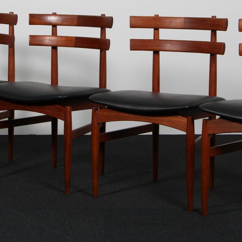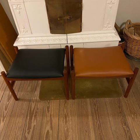 Velholdt Poul Hundevad teak skammel, med originalt skind, med god patina.