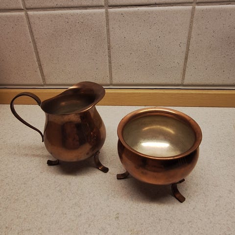 Kobber Sukker flødesæt, Sukker flødesæt der antageligt har været forsølvet en gang. Faconnen og de fine mønstre er fortsat kønne at se på. - Måske kunne sættet anvendes udendørs med husløg plantet deri eller anden lignende dekoration.