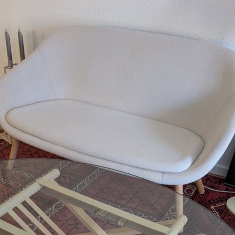 AAL sofa fra Hay i lysegråt læder og med træben.