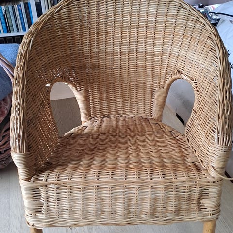 Børnelænestol fremstillet i flettet naturmateriale med en robust konstruktion. Stolen har en naturlig farve og et åbent mønster i ryg og armlæn. Designet til børn med komfortable mål og solid støtte. Velegnet til brug i hjem eller institutioner som siddeplads til børn.