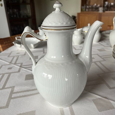 Royal Copenhagen kaffekande med låg i hvid porcelæn. Kanden har et klassisk riflet mønster og er dekoreret med fine guldkantdetaljer. Den har en håndtag designet til nem håndtering og et låg med en dekorativ top. Produktet er egnet til servering af varme drikke og passer til brug i køkken og spisestue. 23.5 cm incl låg