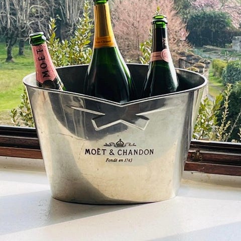 Gammel fransk champagnebowle fra 50'erne, Moët & Chandon - fransk vintage, Super cool og dekorativ gammel fransk champagne køler / champagne bowle fra det hæderkronede gamle champagnehus Moet et Chandon. Champagnekøleren fremstår i lækker tin med en helt perfekt patina! Med champagneproducentens logo indgraveret og den karakteristiske sløjfe. En stor og rummelig køler med god plads til 4 champagneflasker. En virkelig imponerende flot champagnekøler!
