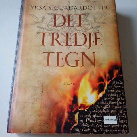 Yrsa Sigurðardóttir Det Tredje Tegn bog med tekst på dansk. Bogens omslag viser en ældet, brændende effekt og indeholder en fortælling, der relaterer til titlen. Indeholder baggrundsinformation og synopsis på bagsiden.
