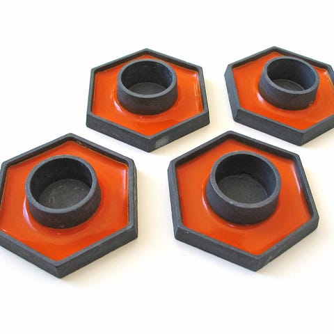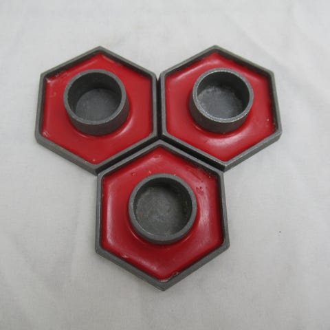 Materialet er metal med guld og rød emalje finish, hvilket giver en solid og dekorativ effekt.