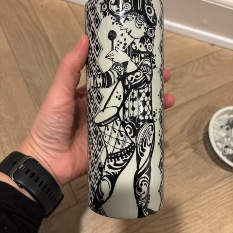 Bjørn Wiinblad Duet Nynolle vase i keramik med sort/hvid dekoration. Højde ca. 21 cm. Designet af Bjørn Wiinblad, model Duet Nynolle, produceret 1958-1966.