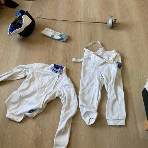 Komplet sæt fægteudstyr til floret, brugt af 13-14-årig dreng.