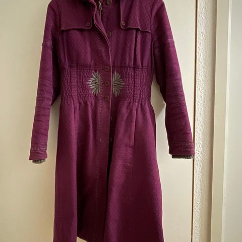 Noa Noa Frakke i blå farve, størrelse M. Jakken har en lang model med knaplukning og lommer på fronten. Materialet og plejeanvisninger er angivet på mærket. Jakken er designet til kvinder.
