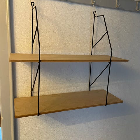 Væghylder i metal og træ.