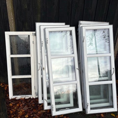 Sæt bestående af fine KPK trævinduer fra 2012 med røde rammer og sprosser. Vinduerne har flere små glasfelter. Passer til renoveringsprojekter eller udskiftning i ældre bygninger. Farven er rød, inde og ude, og vinduerne varierer i størrelse.