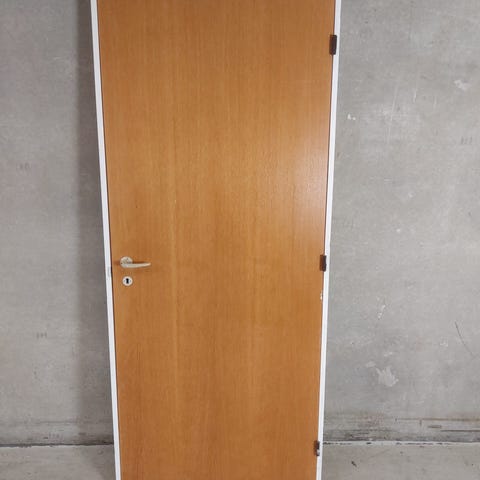 Indvendig dør med egefinér 77,5x204cm i 75mm karm med egetræsbundstykke. Dørpladen måler 73x199,5cm. Ældre dør hvor finéren er i rigtig fin stand med få ridser, karmen har stifthuller og maling. Kan have et enkelt skruehul i dørpladen. Dimension B:77,5 X H:204 X 7,5cm.