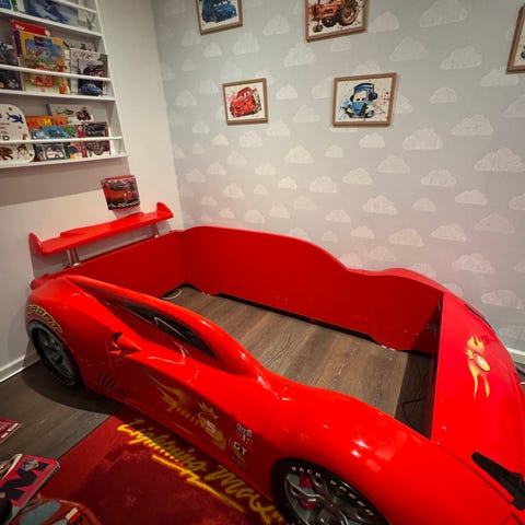Har du en superfan derhjemme? Så har vi seng, bænk, ur til dit barn! Vores dreng biler fase er så småt ved at slutte og vi håber en ny kan få glæde af disse ting.