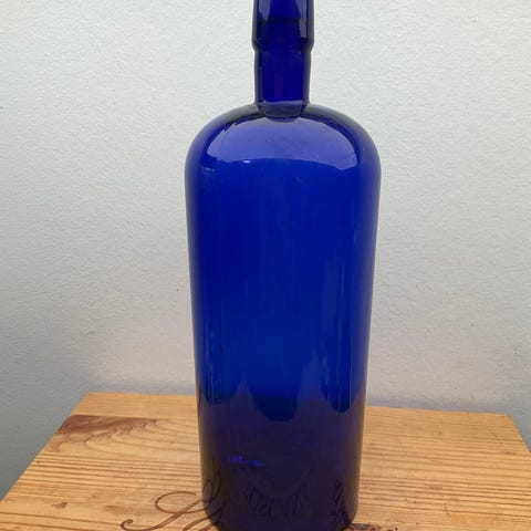 Lilla/brun glas flaske med kork prop - den er 20 cm høj