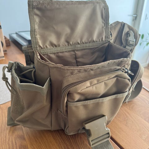 Beretta skulderrem lavet af grøn stof med brune læderdetaljer og metalspænder. Remmen har justerbare remme for tilpasning. Velegnet til forskellige tasker eller udstyr, der kræver en robust og justerbar rem.