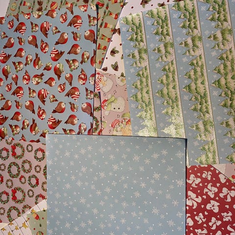 Papir sæt indeholder forskellige mønstre og farver til julepynt og dekoration. Anvendeligt til at lave isblomster, guirlander, flagranker, englehuse, nisser, hjerter, kort og engle. Materialet er papir i forskellige farver og designs, velegnet til kreativt julehåndværk.