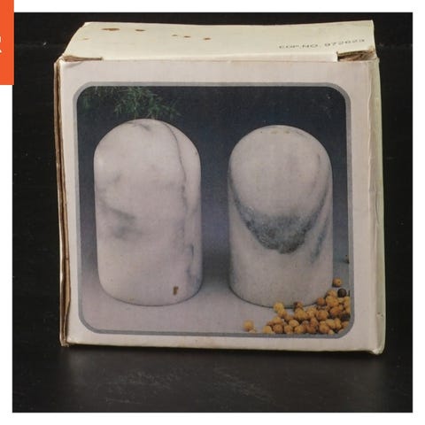 Salt- og pebersæt, i marmor, 11 - 13cm i højden. Begge bøsser er som næsten nye og virker fint. Sender gerne, send info.