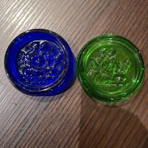 Rigtig fin gammel hinkesten fra Fyens Glasværk, der lavede en serie med 5 forskellige H. C. Andersen Eventyrer; Den lille pige med svovlstikkerne, Fyrtøjet, hyrdinden og skorstensfejeren, Klods hans og Tommelise