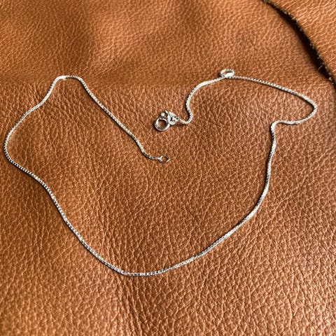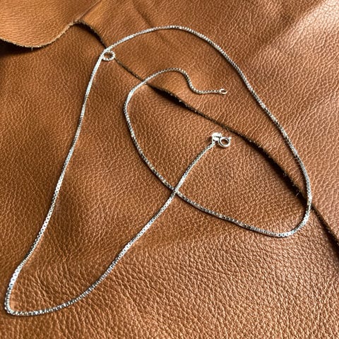1,5 mm kraftig og 70 cm længde smuk halskæde. Smuk alene eller med en ravklump eller andet som vedhæng. Jeg har flere smukke ravklumper fundet ved Vesterhavet omkring Hanstholm.