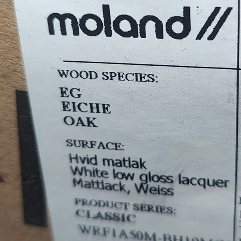 Moland Mitchell Natural Eg laminatgulv med en struktur i børstet og børstet overflade. Produktet leveres i pakker med et samlet areal på 2,39 m². Gulvplankerne er fremstillet i eg og har en naturlig farve.