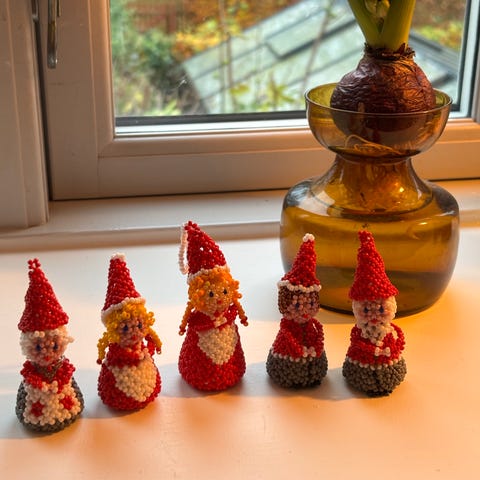 Perlenisser, julepynt, Skønne perle nissepiger , snemand og nisse drenge med forskelligt udtryk
