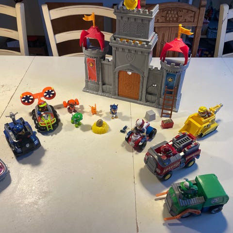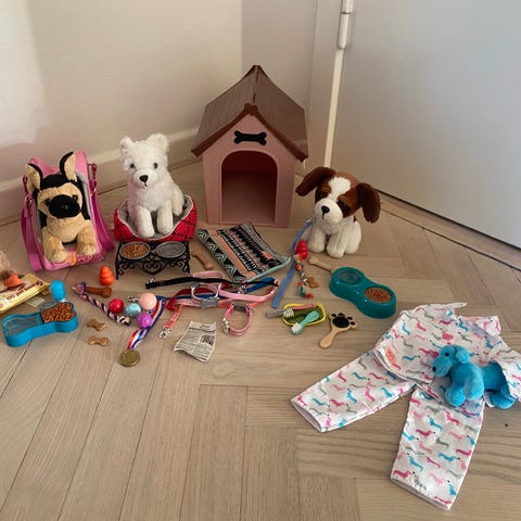 Fin samling med legeplads 6 hunde, en kat og 2 hunde hvalpe, tilbehør snore, bolde, madskålr, bolde, kødben alt med magneter så man kan lege med det. Sælges samlet