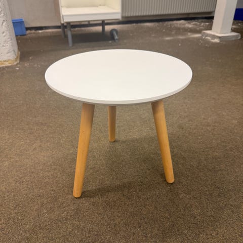 Bordene har hvide, runde bordplader og ben i lyst træ – passer perfekt som sofaborde, natborde eller til hjørner i stuen.