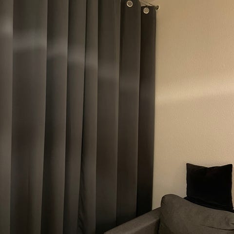 Mørklægningsgardiner fra IKEA. To styks. Har hængt på et kollegieværelse i 5 år. Kommer med gardinringe. Er en smule flosset i kanten, se foto.