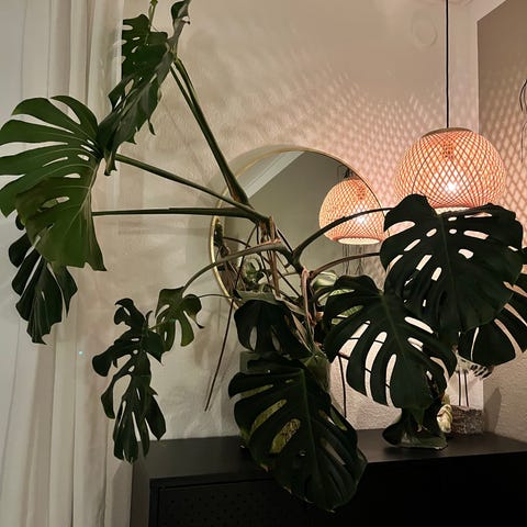 Stor Monstera Deliciosa stueplante med store grønne blade - 1 meter høj. Planten er velegnet til indendørs brug og kræver moderat lys og vanding. Kan afhentes i Holstebro.