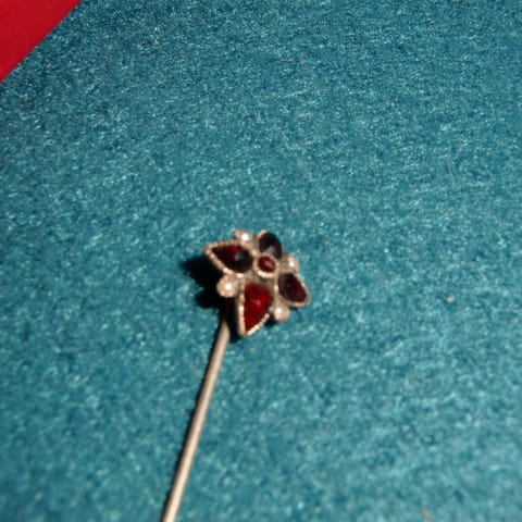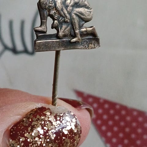 Ca. 5 cm stor spejdernål med råbåndsknob i toppen. Formodentlig i messing. Arvestykke. Kan sendes for købers regning med DAO eller GLS (45 kr. ).