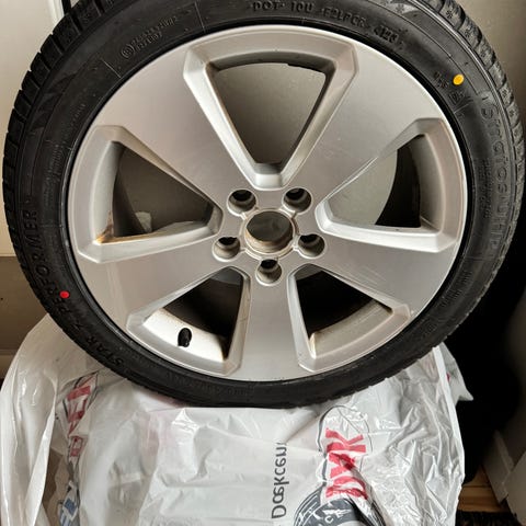 Vores Audi A3 er solgt, og fælgene kan desværre ikke længere bruges. Dæk og fælge er købt sidste vinter, og har kun kørt ca. 1.500 km. Der er ikke nævneværdige ridser på fælgene.