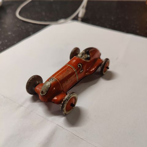 Legetøj, Racerbil, Racerbil i blik - måler 28x16,5 cm. alder Ca. 55 år, lavet i Frankrig. Der er ikke printet noget i bunden af bilen. Lille mærke bag på: "Joustra - Fabrication Francaise" Vurderet til 2000 DKK.