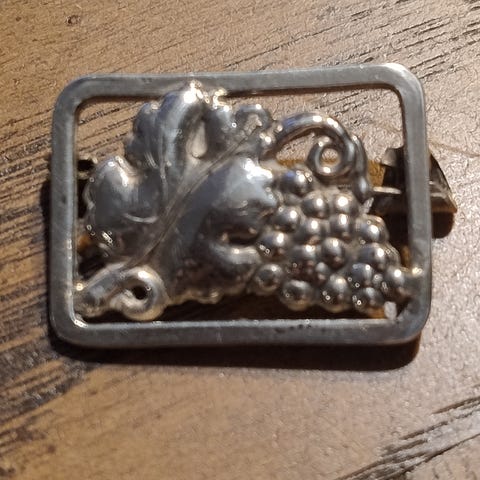 Rektangulær , let buet sølv broche med vindrueranke motiv Stemplet 835 Handarbeit. Måler 5x2cm. Pris kr 150