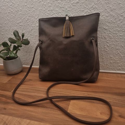 Anden taske, Brun lædertaske med skulderrem. 2 rum indeni og lynlåslomme på bagsiden af tasken. Måler 12 cm i højden, 16 cm i bredden på det bredeste sted og er ca 6 cm dyb.