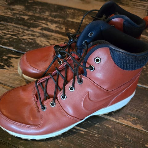 Nike React Element 55 vandresko i størrelse 39. Skoene er sort med røde detaljer og har en hvid sål. Materialet er tekstil og syntetisk. Skoene er designet til vandring og har en let og fleksibel konstruktion. Bemærk, at skoene har brugsspor, herunder slid på indersiden af hælen.