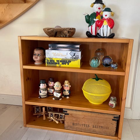 Den ene reol er lidt særlig; plads til bøger eller LP-plader og en kommode sektion med tre fingertappede skuffer.
