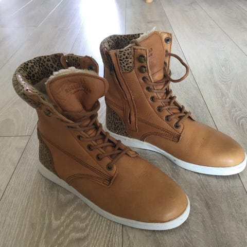 Durango Støvler i størrelse 39, lavet af brunt kraftigt bøffelæder. Støvlerne har en tekstilkant med mønster og snørejustering øverst. Sål med Durango-mærke. Aldrig brugt, som nye. Velegnet til daglig brug.