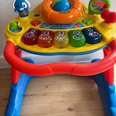 aktivitetslegetøj med musik og lys, designet til børn. Legetøjet har flere farverige knapper og elementer, der stimulerer sanser og motorik.
