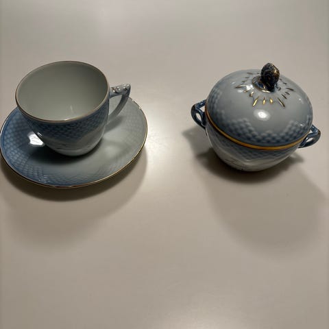 Kaffekopper med sidetallerkener i Mågestellet m/ guldkant . Bing & Grøndahl, 4 sæt & 2 ekstra underkopper. Alt i fin stand . Sælges samlet 125 kr
