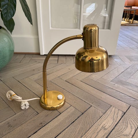 Speciel bordlampe i messing med en trekantet skærm og en afbryder med messing-lænke. Den kan desuden indstilles i højden.
