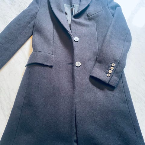 Zara Frakke i blå farve, designet til kvinder i størrelse 34. Jakken er fremstillet i et materiale, der ikke er specificeret, og har en klassisk knaplukning foran. Frakken er velegnet til køligere vejr og har et enkelt, tidløst design.
