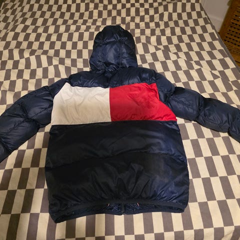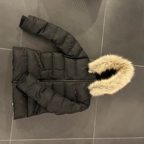 Rigtig fin Tommy Hilfiger dunjakke med aftagelig hætte, med pelskant. Str 176