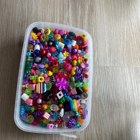 Sæt med perler i forskellige farver, former og materialer, opbevaret i en plastikæske med flere rum. Indeholder blandt andet træperler, plastperler og bogstavperler. Velegnet til smykkefremstilling, hobbyprojekter og kreative aktiviteter.