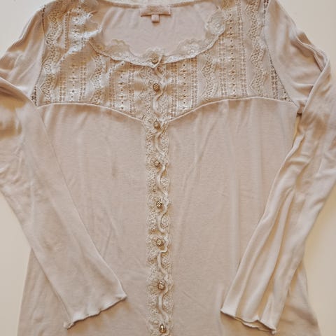 Flot blonde bluse str M fra Buch Copenhagen. Farven er mørkegrøn med guldskær i blonderne. Flot stand.