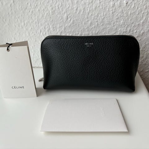 Sort clutch, kosmetikpung, makeup pung med sølv lynlås fra Celine. Har slidtage indvendigt og et lille “trykmærke” på ydersiden. Ellers i god stand.