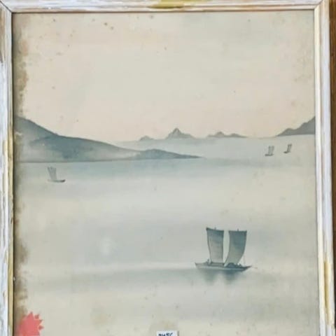 h: 80,5, b: 55,5, motiv: Kvinde og tiger på sofa, Indisk Gouache på silkestof, unika, uden årstal, men er i hvert fald over 35 år gammelt, indrammet i sølvfarvet træramme. Skal ses. NB. Sendes ikke men kan ses i Finlandsgade på Amager!!