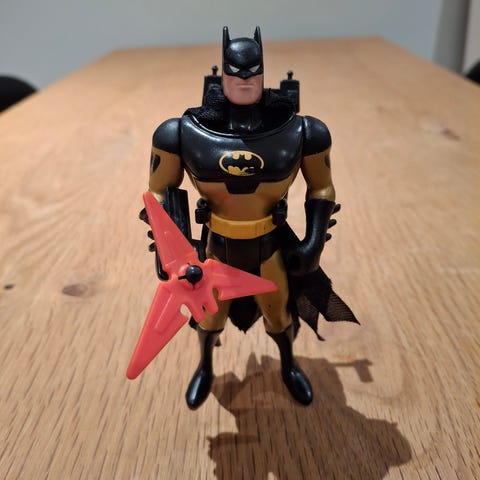 Combat Belt (Classic) Batman fra Batman the Animated Series. DC Comics. Udgivet af Kenner i 1993. Kommer med sin originale kappe og Bat-missile, men ikke andet tilbehør. Det originale Batman outfit fra serien i klassisk grå, sort og gul. Se også mine andre annoncer for andet retro legetøj.