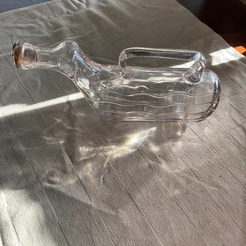 Super vovse i glas, med praktisk håndtag til at bære og hælde. Jeg tror den kan mange tricks og derfor indeholde Meget forskelligt. Ikke kun snaps! ;) Ejeren bestemmer. Med fuld mave kan den indeholde ca 70 cl. Hovedformen gør at den kan klukke. Men den gør ikke. Og er ellers stille. Ca 14 cm høj og 26 cm lang. #festlig #trofølgesvend #allelejligheder #altidgladnårmankommerhjem