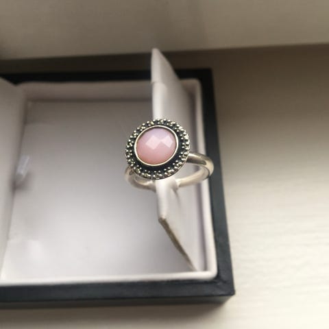 Ringen har form som et lille lyserødt hjerte med zirkoner.