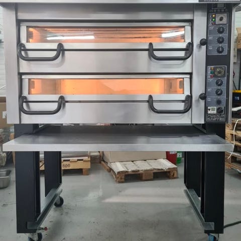 Pizzaovn i rustfrit stål med to kamre. Modellen har en kapacitet på 200 kg og en effekt på 14,4 kW. Designet til professionel