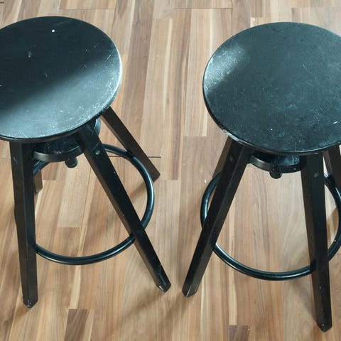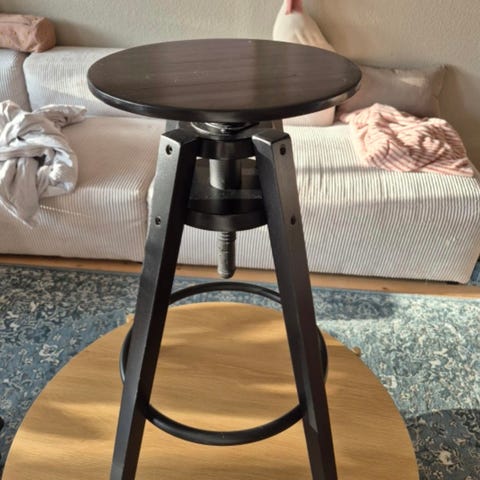 Skammel med indstilleligt sæde, sortmalet træ. Højde fra 45-55cm.